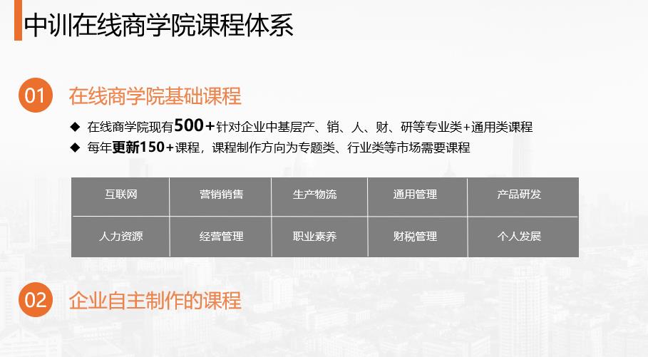 在線商學(xué)院現(xiàn)有500+針對企業(yè)中基層產(chǎn)、銷、人、財(cái)、研等專業(yè)類+通用類課程。每年更新150+課程,課程制作方向?yàn)閷n}類、行業(yè)類等市場需要課程